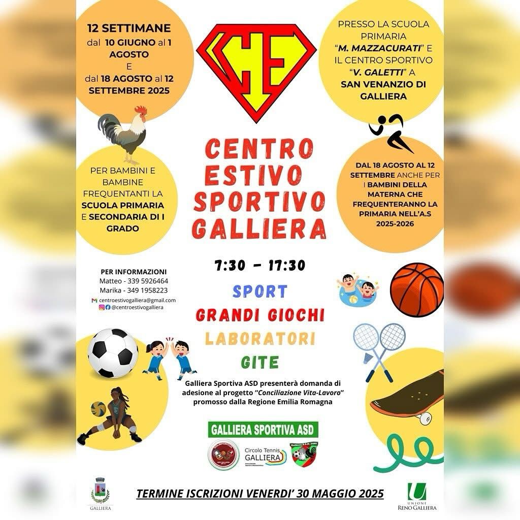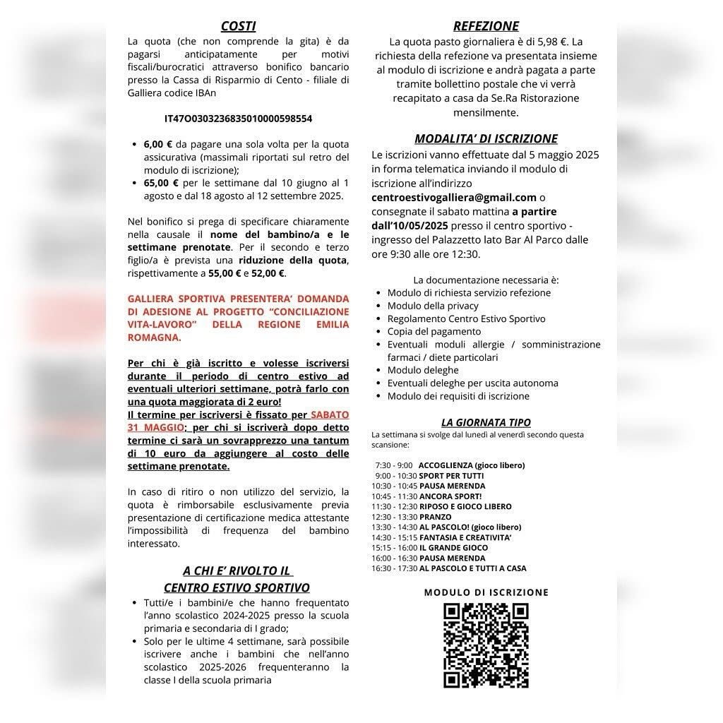 É possibile iscriversi fino 𝗮𝗹 𝟯𝟭 𝗺𝗮𝗴𝗴𝗶𝗼 𝟮𝟬𝟮𝟱 in forma telematica inviando la modulistica all’indirizzo email centroestivogalliera@gmail.com o tramite consegna a mano a partire da sabato 3 maggio, tutti i sabati presso il centro sportivo – palazzetto dello sport dalle ore 9.30 alle ore 12.30.
