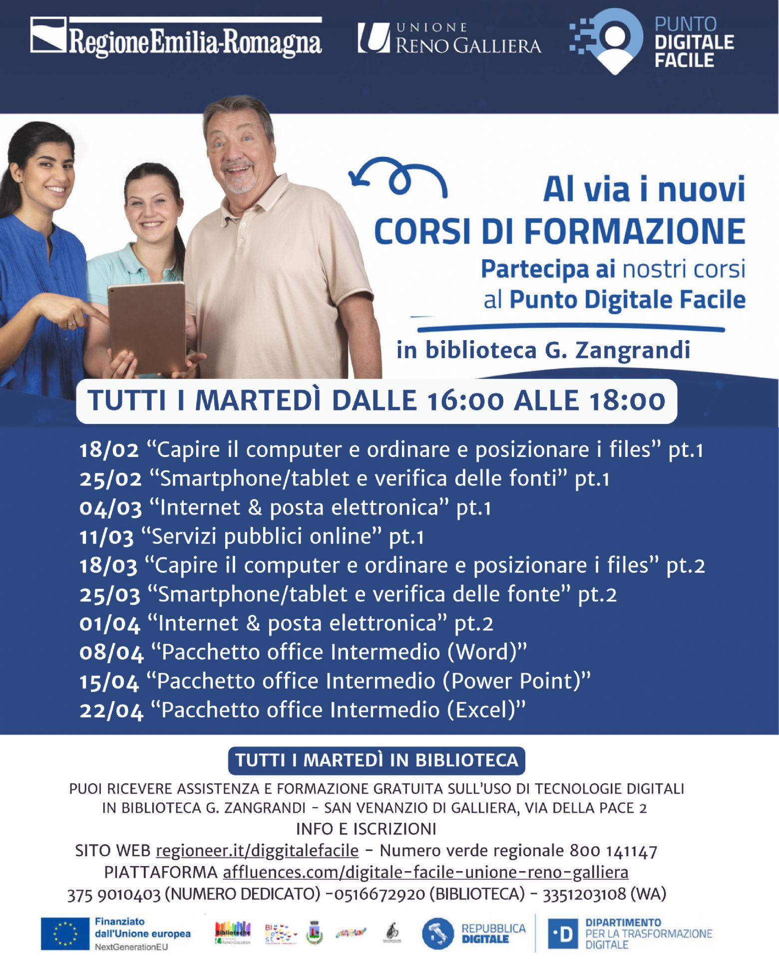 I corsi, completamente gratuiti e realizzati in tutti i Comuni dell’Unione Reno Galliera, includono: