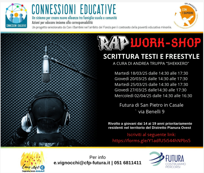 Sono aperte le iscrizioni a Rap Work-Shop, due laboratori pomeridiani gratuiti dedicati alla scrittura di testi e al freestyle, organizzati da Futura, società pubblica che si occupa di formazione e sviluppo del territorio. Gli incontri si svolgeranno nei mesi di marzo e aprile presso le sedi di San Giovanni in Persiceto (dal 17 marzo) e San Pietro in Casale (dal 18 marzo).