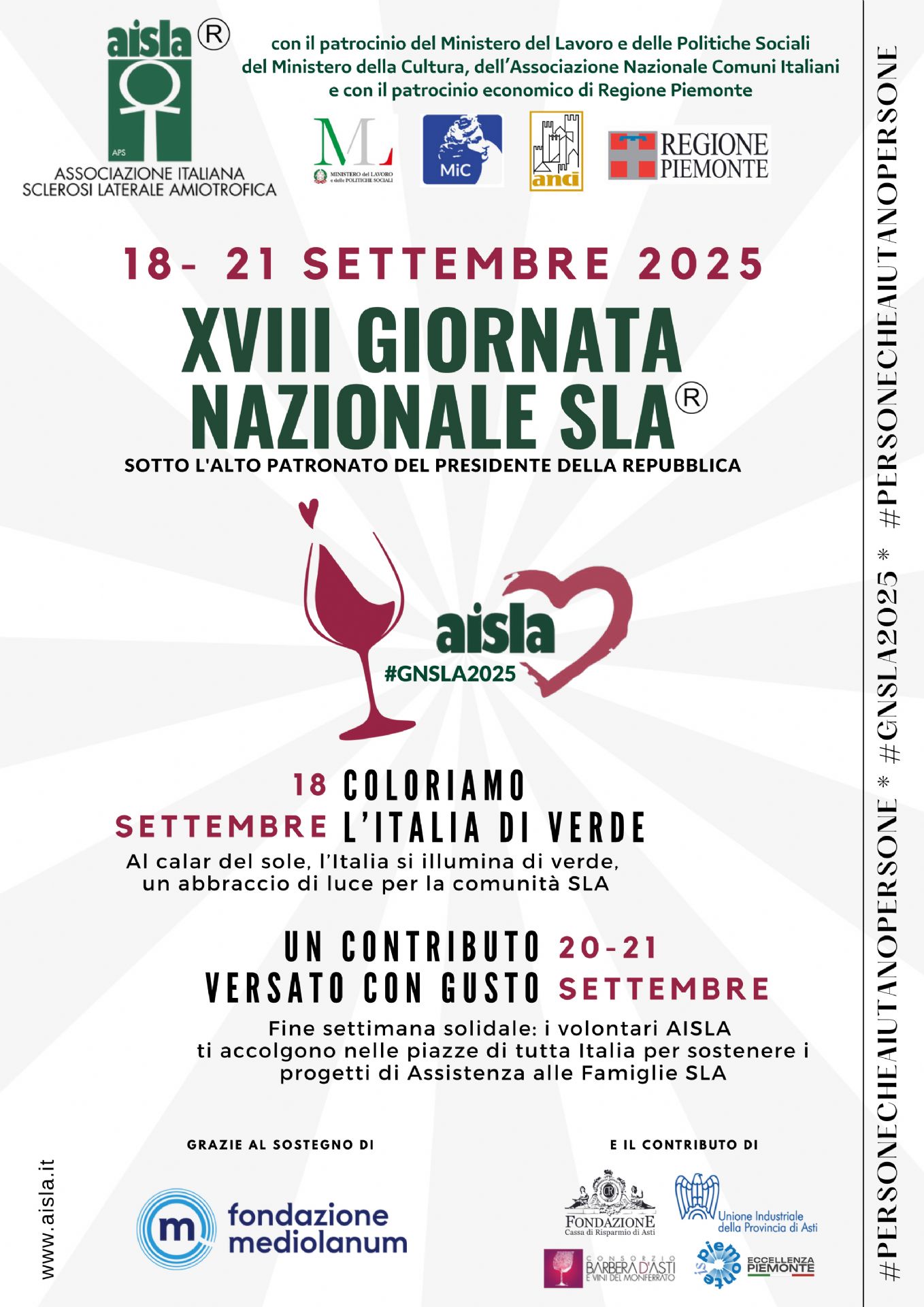 Dal 18 al 21 settembre 2025, avrà luogo la campagna nazionale “Coloriamo l’Italia di verde”, in occasione della XVIII Giornata Nazionale sulla SLA – Sclerosi Laterale Amiotrofica, promossa da AISLA – Associazione Italiana Sclerosi Laterale Amiotrofica, che vedrà l’illuminazione in verde di piazze e monumenti italiani, simbolo del colore di AISLA e della speranza.