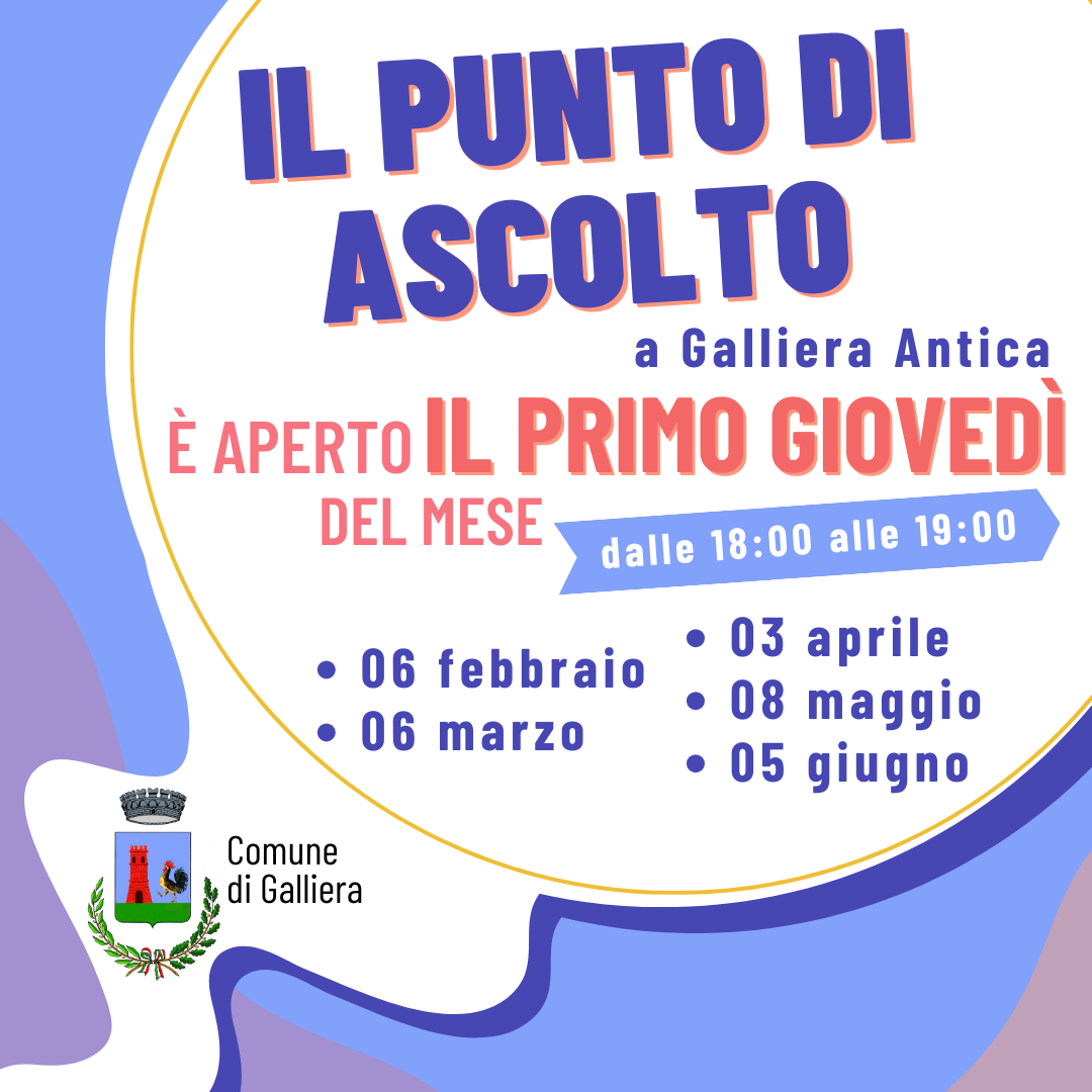 Il Punto Di Ascolto a Galliera Antica, presso il locale adiacente al Centro Medico di via Coronella 75/a, è aperto IL PRIMO GIOVEDÌ DEL MESE dalle 18:00 alle 19:00.