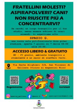Sempre in questa pagina trovate il Regolamento dello Spazio G., da leggere con grande attenzione e sottoscrivere in ogni sua parte; al suo interno troverete ogni indicazione utile per una corretta fruizione della struttura.